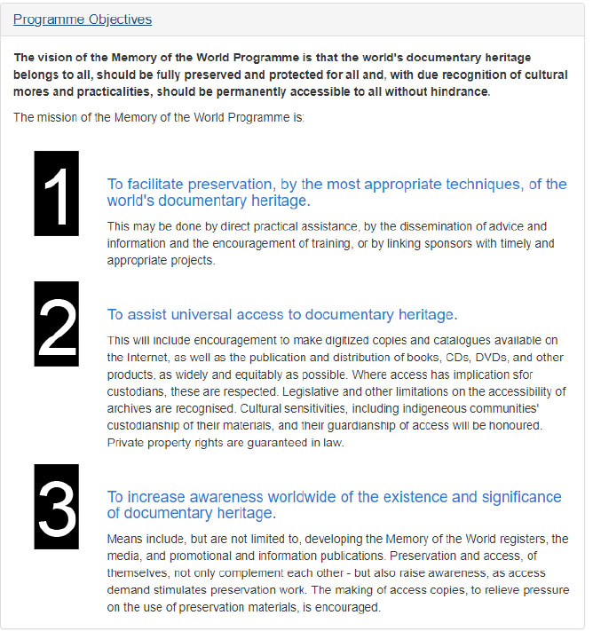 The UNESCO Australian Memory of the World Program is part of a worldwide UNESCO initiative to safeguard and preserve documentary heritage, and make it accessible. The Australian Program has existed since 2000, and has compiled a register of documentary heritage of significance to Australia. Of the 59 items on the Register, only one relates to the Performing Arts.